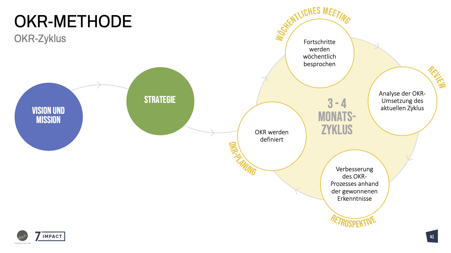 - Retrospektive: In der Retrospektive wird nicht der Inhalt, sondern der OKR-Prozess selbst reflektiert und für den nächsten Zyklus verbessert.